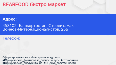 BEARFOOD, бистро-маркет по адресу 453102, Башкортостан, Стерлитамак, Воинов-Интернационалистов, 25а в дальнейшем Организация, размещена в следующих категориях: