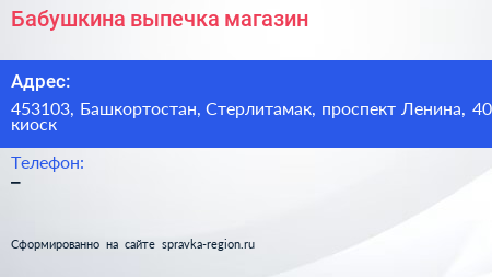 Бабушкина выпечка, магазин по адресу 453103, Башкортостан, Стерлитамак, проспект Ленина, 40 киоск в дальнейшем Организация, размещена в следующих категориях: