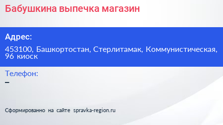 Бабушкина выпечка, магазин по адресу 453100, Башкортостан, Стерлитамак, Коммунистическая, 96 киоск в дальнейшем Организация, размещена в следующих категориях: