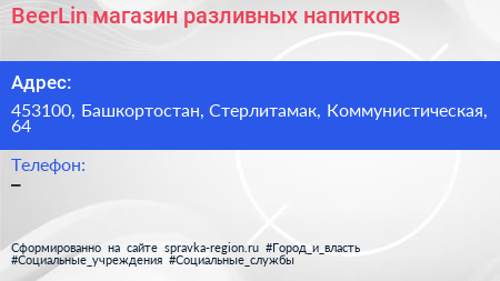 BeerLin, магазин разливных напитков по адресу 453100, Башкортостан, Стерлитамак, Коммунистическая, 64 в дальнейшем Организация, размещена в следующих категориях: