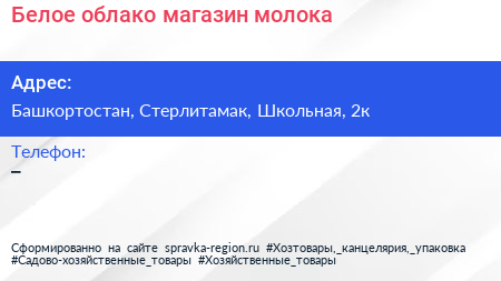 Белое облако, магазин молока по адресу Башкортостан, Стерлитамак, Школьная, 2к в дальнейшем Организация, размещена в следующих категориях:
