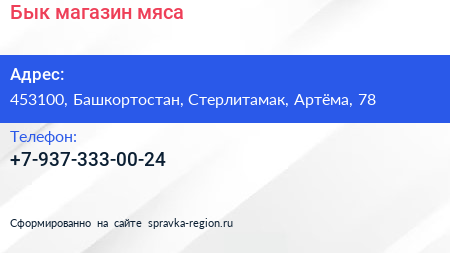 Бык, магазин мяса по адресу 453100, Башкортостан, Стерлитамак, Артёма, 78 в дальнейшем Организация, размещена в следующих категориях: