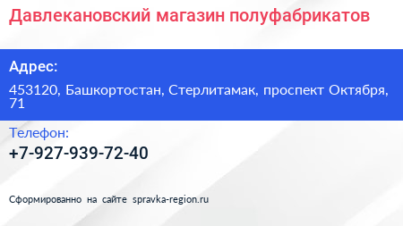 Давлекановский, магазин полуфабрикатов по адресу 453120, Башкортостан, Стерлитамак, проспект Октября, 71 в дальнейшем Организация, размещена в следующих категориях: