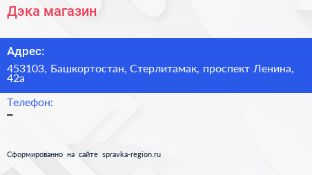 Дэка, магазин по адресу 453103, Башкортостан, Стерлитамак, проспект Ленина, 42а в дальнейшем Организация, размещена в следующих категориях: