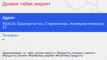 Дымок, табак-маркет по адресу 453118, Башкортостан, Стерлитамак, Коммунистическая, 15 в дальнейшем Организация, размещена в следующих категориях: