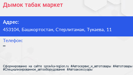Дымок, табак-маркет по адресу 453104, Башкортостан, Стерлитамак, Тукаева, 11 в дальнейшем Организация, размещена в следующих категориях: