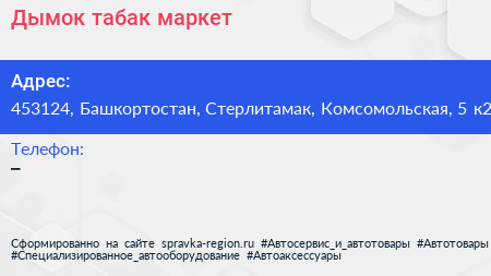 Дымок, табак-маркет по адресу 453124, Башкортостан, Стерлитамак, Комсомольская, 5 к2 в дальнейшем Организация, размещена в следующих категориях: