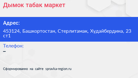 Дымок, табак-маркет по адресу 453124, Башкортостан, Стерлитамак, Худайбердина, 23 ст1 в дальнейшем Организация, размещена в следующих категориях: