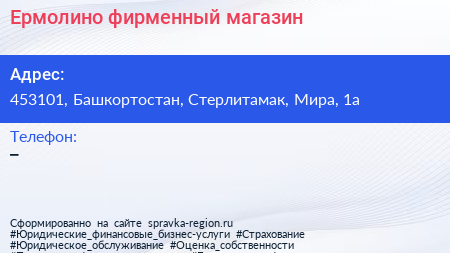 Ермолино, фирменный магазин по адресу 453101, Башкортостан, Стерлитамак, Мира, 1а в дальнейшем Организация, размещена в следующих категориях: