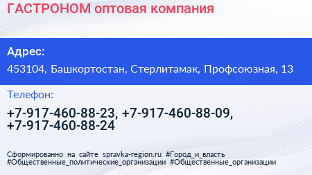 ГАСТРОНОМ, оптовая компания по адресу 453104, Башкортостан, Стерлитамак, Профсоюзная, 13 в дальнейшем Организация, размещена в следующих категориях:
