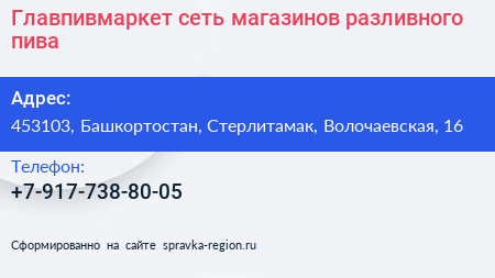 Главпивмаркет, сеть магазинов разливного пива по адресу 453103, Башкортостан, Стерлитамак, Волочаевская, 16 в дальнейшем Организация, размещена в следующих категориях: