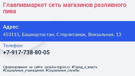 Главпивмаркет, сеть магазинов разливного пива по адресу 453115, Башкортостан, Стерлитамак, Вокзальная, 13 в дальнейшем Организация, размещена в следующих категориях: