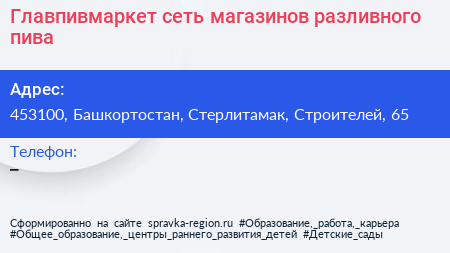 Главпивмаркет, сеть магазинов разливного пива по адресу 453100, Башкортостан, Стерлитамак, Строителей, 65 в дальнейшем Организация, размещена в следующих категориях:
