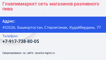 Главпивмаркет, сеть магазинов разливного пива по адресу 453126, Башкортостан, Стерлитамак, Худайбердина, 77 в дальнейшем Организация, размещена в следующих категориях: