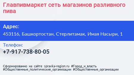 Главпивмаркет, сеть магазинов разливного пива по адресу 453116, Башкортостан, Стерлитамак, Имая Насыри, 1 в дальнейшем Организация, размещена в следующих категориях:
