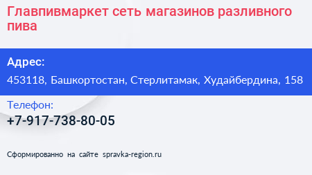 Главпивмаркет, сеть магазинов разливного пива по адресу 453118, Башкортостан, Стерлитамак, Худайбердина, 158 в дальнейшем Организация, размещена в следующих категориях: