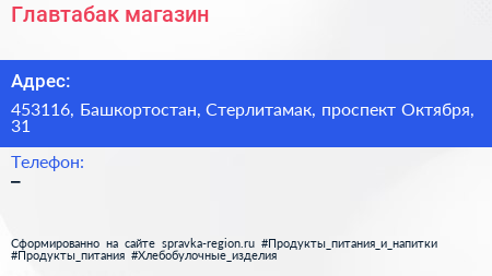 Главтабак, магазин по адресу 453116, Башкортостан, Стерлитамак, проспект Октября, 31 в дальнейшем Организация, размещена в следующих категориях: