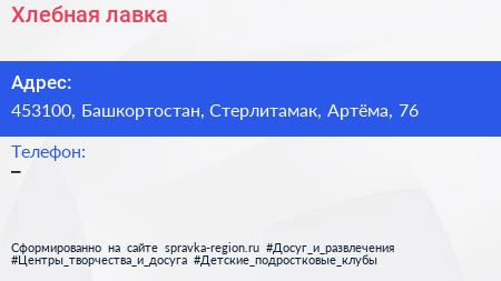 Хлебная лавка по адресу 453100, Башкортостан, Стерлитамак, Артёма, 76 в дальнейшем Организация, размещена в следующих категориях: