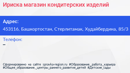 Ириска, магазин кондитерских изделий по адресу 453116, Башкортостан, Стерлитамак, Худайбердина, 85/3 в дальнейшем Организация, размещена в следующих категориях: