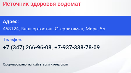 Источник здоровья, водомат по адресу 453124, Башкортостан, Стерлитамак, Мира, 56 в дальнейшем Организация, размещена в следующих категориях:
