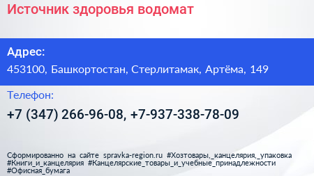 Источник здоровья, водомат по адресу 453100, Башкортостан, Стерлитамак, Артёма, 149 в дальнейшем Организация, размещена в следующих категориях: