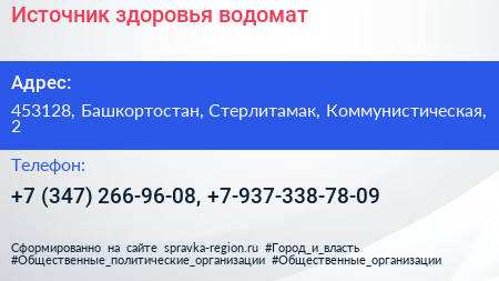 Источник здоровья, водомат по адресу 453128, Башкортостан, Стерлитамак, Коммунистическая, 2 в дальнейшем Организация, размещена в следующих категориях: