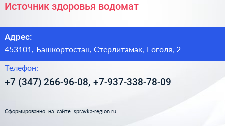 Источник здоровья, водомат по адресу 453101, Башкортостан, Стерлитамак, Гоголя, 2 в дальнейшем Организация, размещена в следующих категориях: