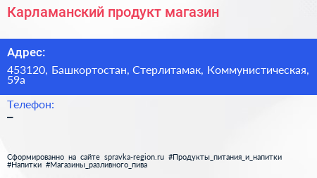 Карламанский продукт, магазин по адресу 453120, Башкортостан, Стерлитамак, Коммунистическая, 59а в дальнейшем Организация, размещена в следующих категориях: