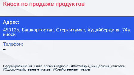 Киоск по продаже продуктов по адресу 453126, Башкортостан, Стерлитамак, Худайбердина, 74а киоск в дальнейшем Организация, размещена в следующих категориях: