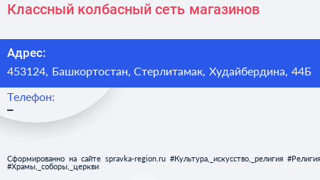 Классный колбасный, сеть магазинов по адресу 453124, Башкортостан, Стерлитамак, Худайбердина, 44Б в дальнейшем Организация, размещена в следующих категориях: