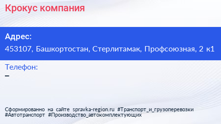 Крокус, компания по адресу 453107, Башкортостан, Стерлитамак, Профсоюзная, 2 к1 в дальнейшем Организация, размещена в следующих категориях: