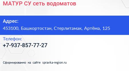 МАТУР СУ, сеть водоматов по адресу 453100, Башкортостан, Стерлитамак, Артёма, 125 в дальнейшем Организация, размещена в следующих категориях: