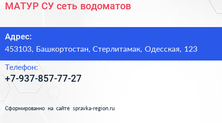 МАТУР СУ, сеть водоматов по адресу 453103, Башкортостан, Стерлитамак, Одесская, 123 в дальнейшем Организация, размещена в следующих категориях: