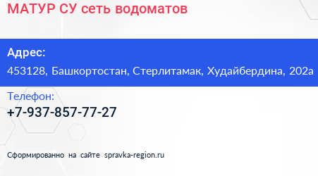 МАТУР СУ, сеть водоматов по адресу 453128, Башкортостан, Стерлитамак, Худайбердина, 202а в дальнейшем Организация, размещена в следующих категориях: