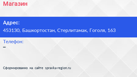 Магазин по адресу 453130, Башкортостан, Стерлитамак, Гоголя, 163 в дальнейшем Организация, размещена в следующих категориях: