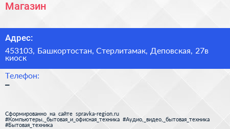 Магазин по адресу 453103, Башкортостан, Стерлитамак, Деповская, 27в киоск в дальнейшем Организация, размещена в следующих категориях: