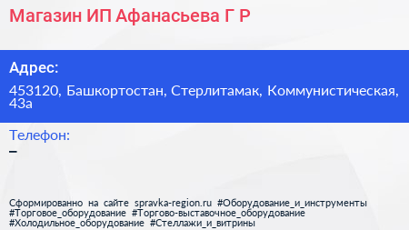 Магазин, ИП Афанасьева Г.Р. по адресу 453120, Башкортостан, Стерлитамак, Коммунистическая, 43а в дальнейшем Организация, размещена в следующих категориях: