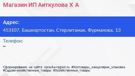 Магазин, ИП Аиткулова Х.А. по адресу 453107, Башкортостан, Стерлитамак, Фурманова, 13 в дальнейшем Организация, размещена в следующих категориях: