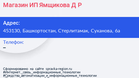 Магазин, ИП Ямщикова Д.Р. по адресу 453130, Башкортостан, Стерлитамак, Суханова, 6а в дальнейшем Организация, размещена в следующих категориях: