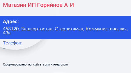 Магазин, ИП Горяйнов А.И. по адресу 453120, Башкортостан, Стерлитамак, Коммунистическая, 43а в дальнейшем Организация, размещена в следующих категориях: