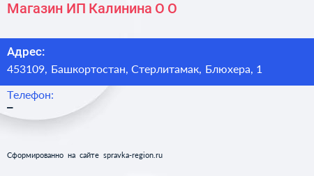 Магазин, ИП Калинина О.О. по адресу 453109, Башкортостан, Стерлитамак, Блюхера, 1 в дальнейшем Организация, размещена в следующих категориях: