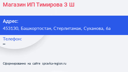 Магазин, ИП Тимирова З.Ш. по адресу 453130, Башкортостан, Стерлитамак, Суханова, 6а в дальнейшем Организация, размещена в следующих категориях: