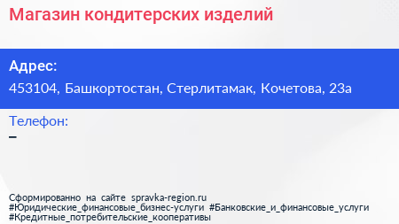 Магазин кондитерских изделий по адресу 453104, Башкортостан, Стерлитамак, Кочетова, 23а в дальнейшем Организация, размещена в следующих категориях: