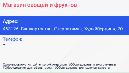 Магазин овощей и фруктов по адресу 453126, Башкортостан, Стерлитамак, Худайбердина, 70 в дальнейшем Организация, размещена в следующих категориях: