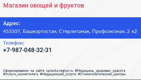 Магазин овощей и фруктов по адресу 453107, Башкортостан, Стерлитамак, Профсоюзная, 2 к2 в дальнейшем Организация, размещена в следующих категориях: