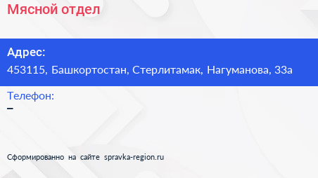 Мясной отдел по адресу 453115, Башкортостан, Стерлитамак, Нагуманова, 33а в дальнейшем Организация, размещена в следующих категориях: