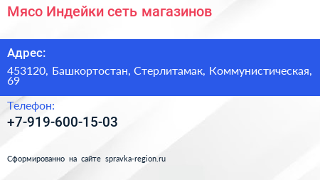 Мясо Индейки, сеть магазинов по адресу 453120, Башкортостан, Стерлитамак, Коммунистическая, 69 в дальнейшем Организация, размещена в следующих категориях: