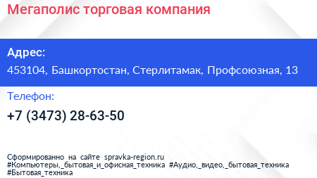 Мегаполис, торговая компания по адресу 453104, Башкортостан, Стерлитамак, Профсоюзная, 13 в дальнейшем Организация, размещена в следующих категориях: