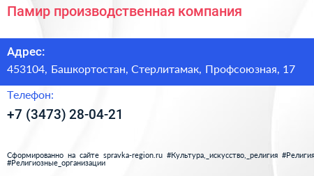 Памир, производственная компания по адресу 453104, Башкортостан, Стерлитамак, Профсоюзная, 17 в дальнейшем Организация, размещена в следующих категориях: