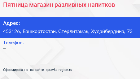 Пятница, магазин разливных напитков по адресу 453126, Башкортостан, Стерлитамак, Худайбердина, 73 в дальнейшем Организация, размещена в следующих категориях: